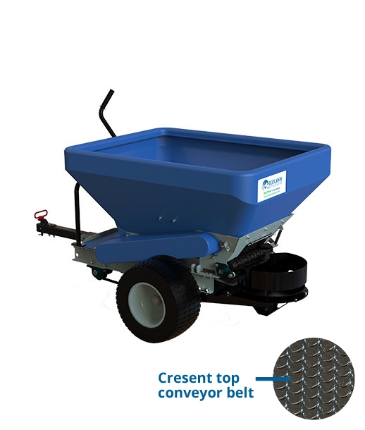 - Its wheel-driven system powers both the conveyor and the single-disc spinner as soon as your machine moves—no engine or hydraulics required. Built to tow perfectly behind ride-on mowers like Walker Mowers, the ECO50 also hitches easily to ATVs, tractors, and utility vehicles, giving you flexibility across a range of equipment.